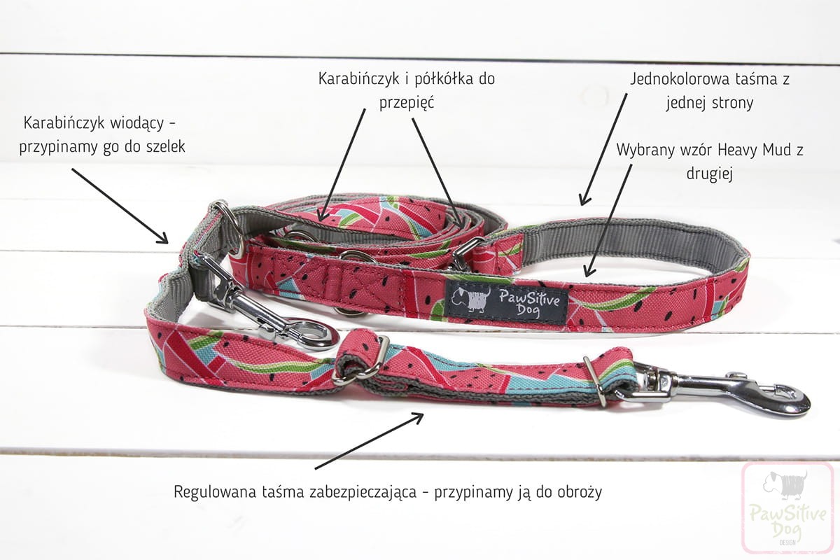 Nasze produkty szyjemy ręcznie. Dbamy o to, by tkaniny były doskonałej jakości. Starannie dobraliśmy okucia, gdyż zależy nam nie tylko na wyglądzie, ale również na bezpieczeństwie Twojego psa. Smycze wykonujemy z taśmy jednostronnie, na całej długości obszytej wybranym wzorem tkaniny Heavy Mud (poliester wodoodporny).